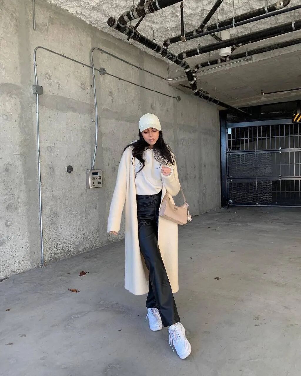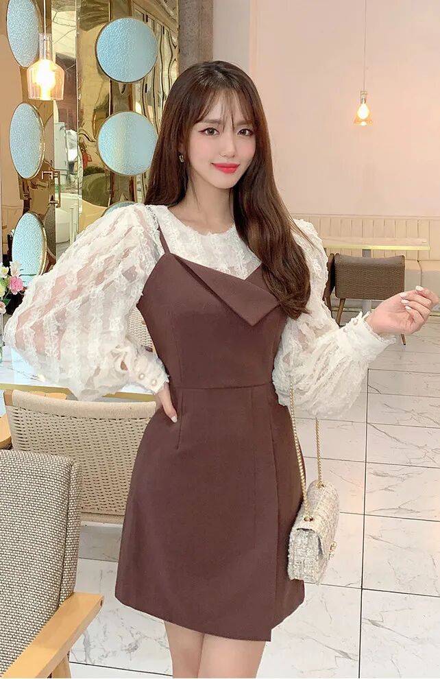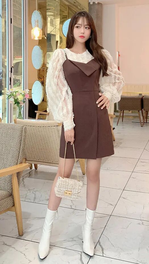 裸色系镂空设计的内搭配上咖色吊带翻领紧身连衣裙,再加一双白色中筒弹力靴,是温温柔柔的淑女名媛风没错了。