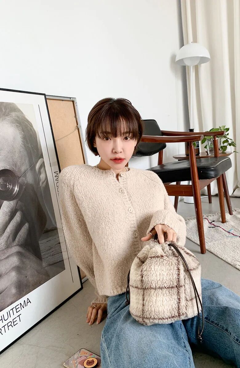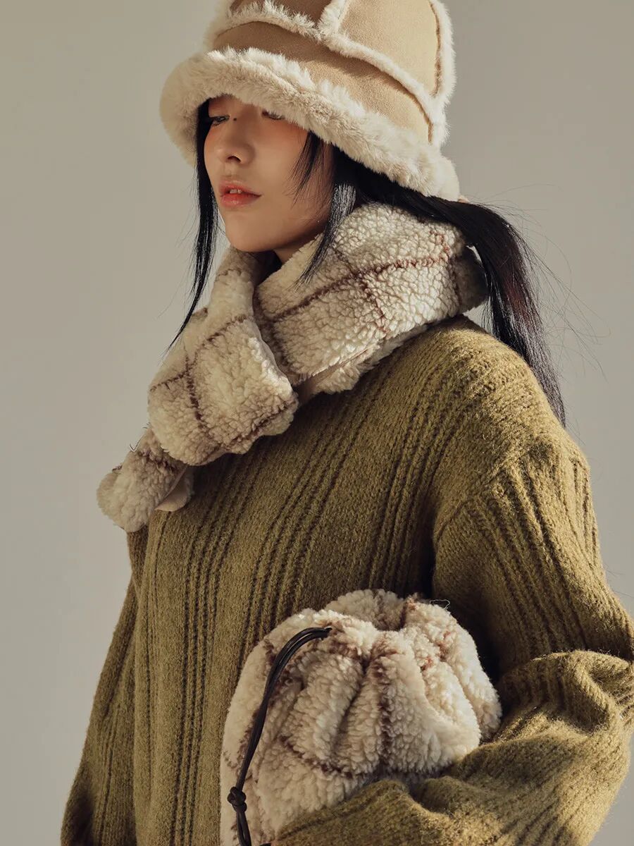 这个内口袋仿羊羔绒格纹抽绳水桶包看起来格外别致,涤纶的质地,抽绳的闭合方式,日韩风的格子纹使之非常百搭。
