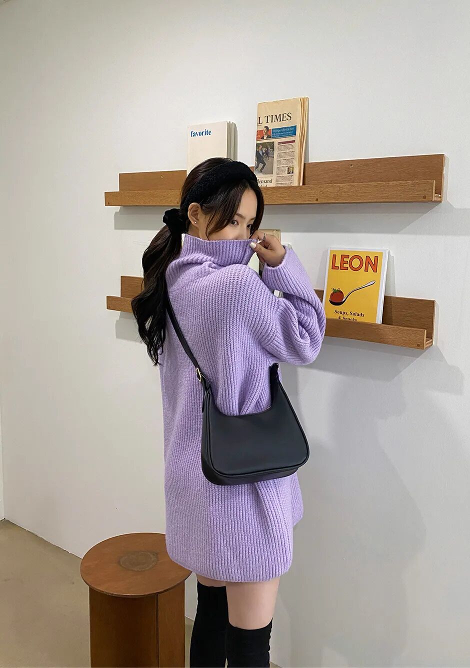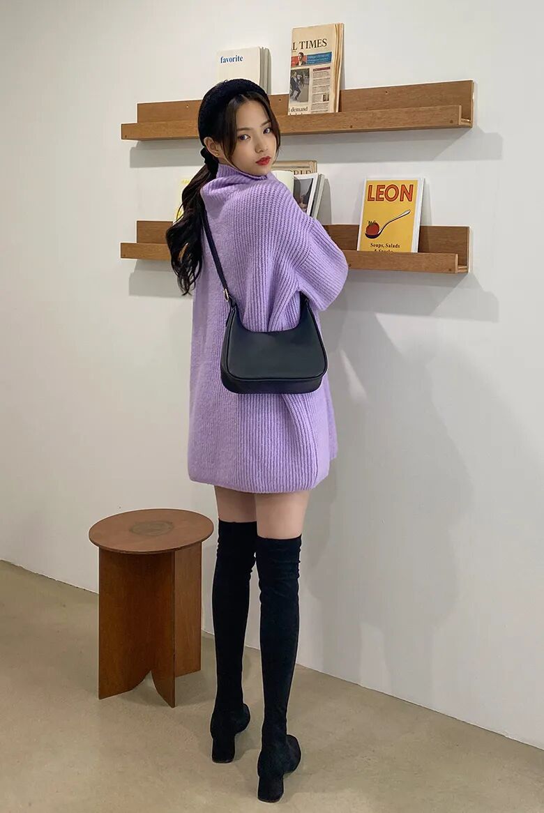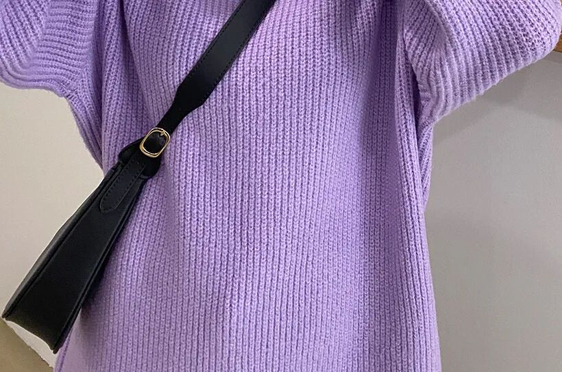软把的提拎部件斜跨在肩头毫无负重感,镶嵌在温柔香芋色的毛衣间,形状像极了一弯新月,因此又名新月包。