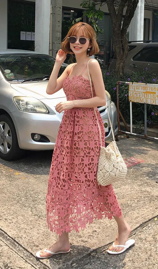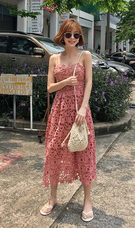 与同样镂空纹路的艳粉色吊带长裙相配,好像清凉中的一抹温存。可以预见它与针织衫的组合,定也不会让你失望。