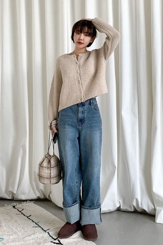 简单保暖的针织开衫配上休闲牛仔裤,清甜可口的下午茶将水桶包塞得鼓鼓的。一同度过充满艺术气息的冬日午后吧。