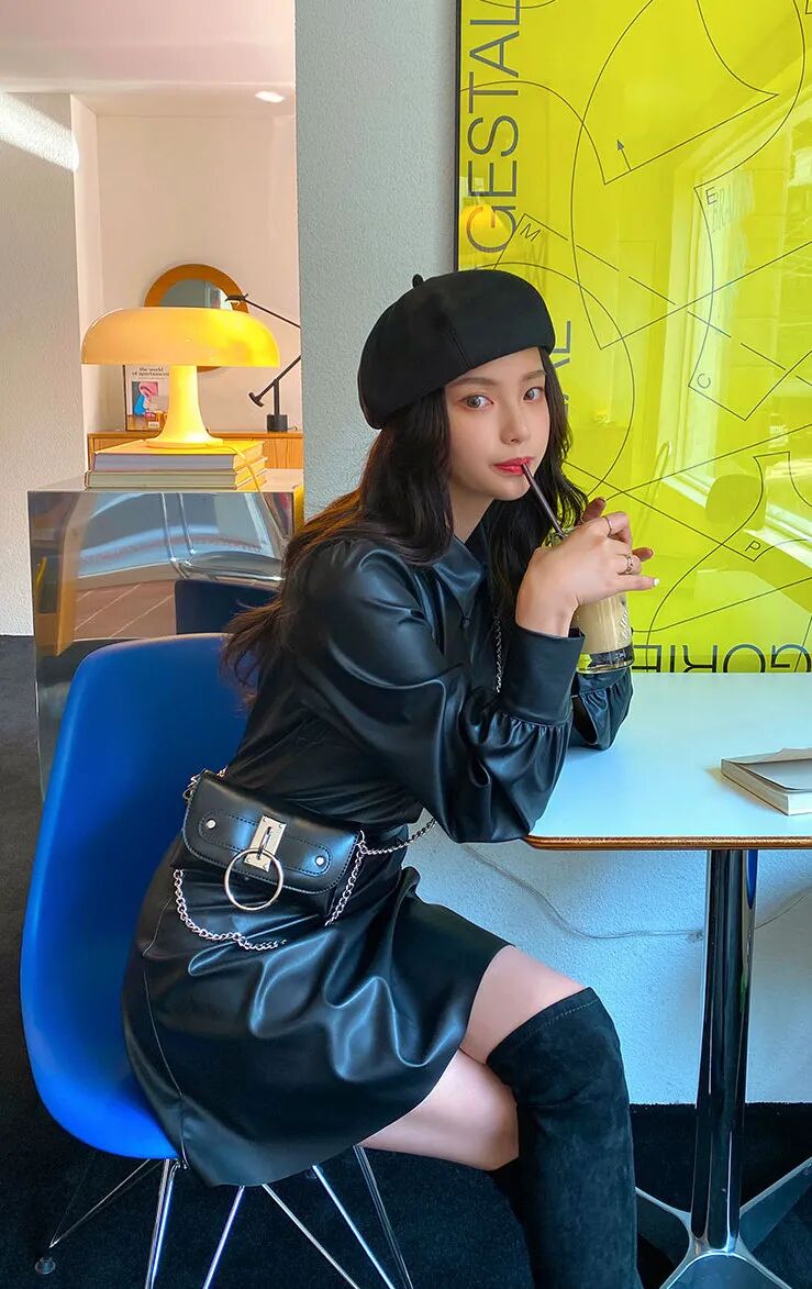 一根金属链条斜斜地跨在身上,与蓝灰色高领毛衣和黑色百褶裙搭配到一起,更像是一个小巧的装饰物,很难不引人侧目。