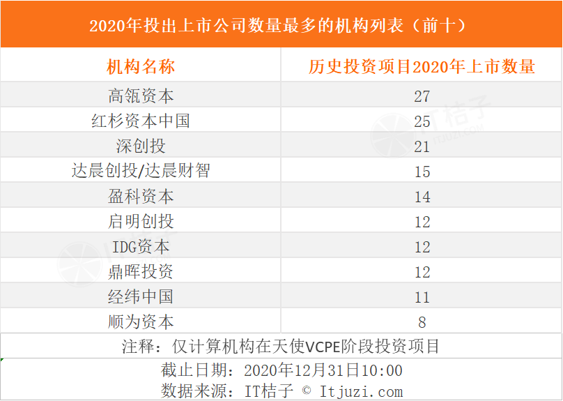 IT 桔子数据记录中,达晨创投、盈科资本、启明创投、IDG 资本、鼎晖投资、经纬中国、顺为资本等机构在 2020 年也都收获颇丰。