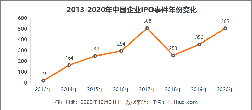 到 2020 年的最后一天时,今年内完成上市的中国公司数量达到了 505 家。这个数字几乎要与 2021 年的顶峰时刻相近。