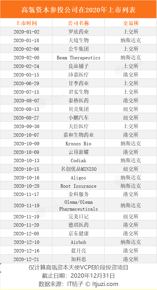 IT 桔子数据显示,2020 年高瓴资本在 VC/PE 阶段参与投资、首次上市的公司有 27 家,包括京东健康、完美日记、小鹏汽车、贝壳集团、天境生物等。除此之外,投资横跨一二级市场的高瓴还有十多个在基石轮参与的项目不做计入。