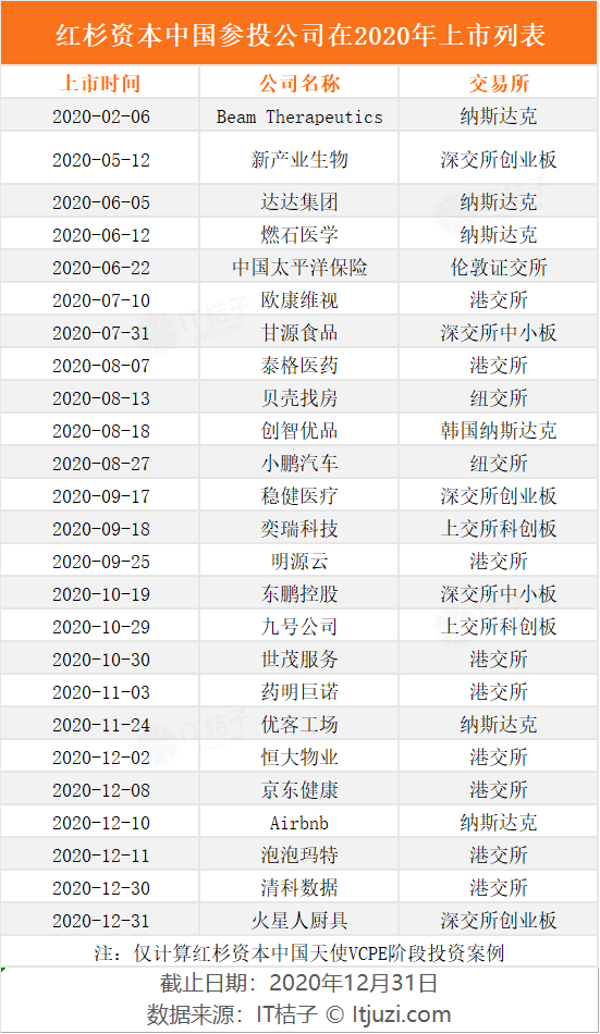 红杉资本中国在 2020 年内收获了 25 个在 VC/PE 阶段参与的 IPO 项目。
