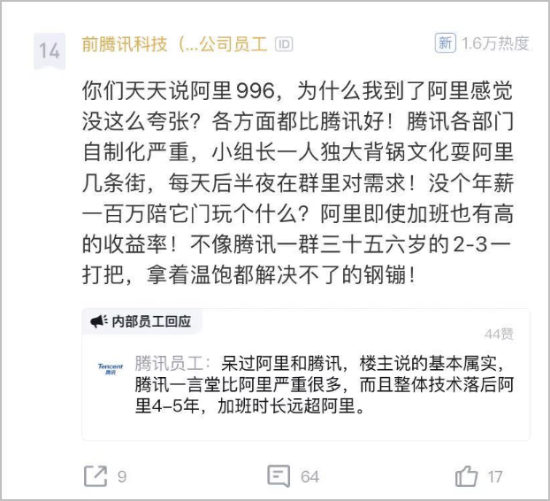 腾讯员工也加入战斗,表示鹅厂的加班时长远超阿里,每天“后半夜在群里对需求”,给的钱“连温饱都解决不了”(这应该是夸张手法,倒也不至于):