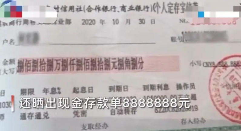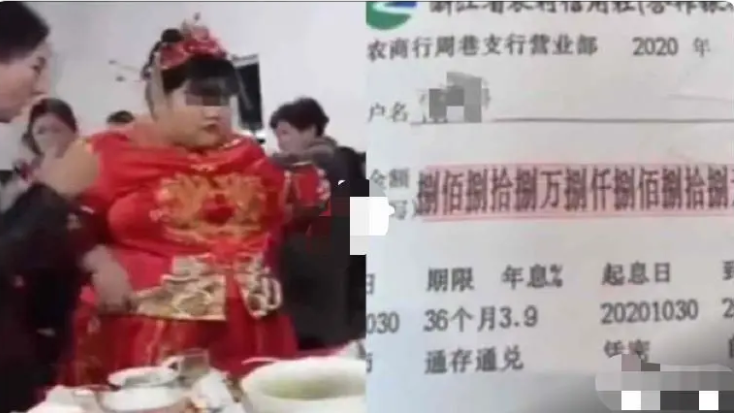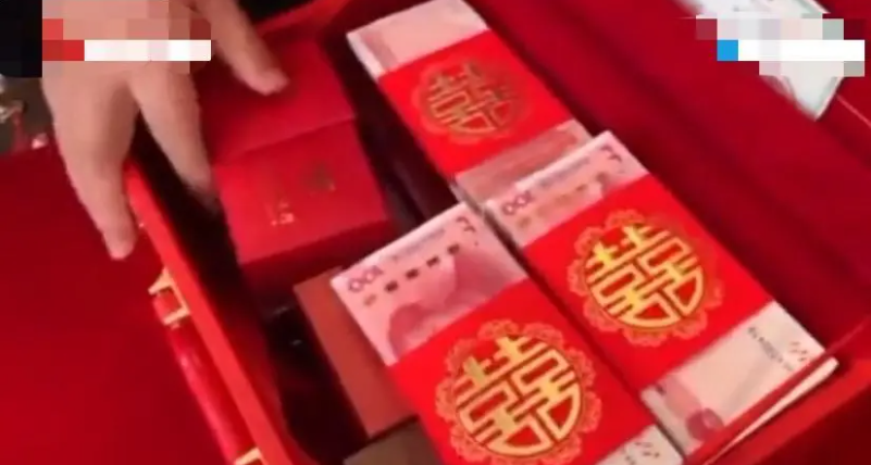 除此之外,另外一个引发关注的点是新娘家境不凡,所有送亲人员均是手拿金银细软,最吸引眼球的当属陪嫁的银行存折,上书8888888元(八百八十八万八千八百八十八元)。加上其他的现金、实物以及房屋,女方嫁妆总价值高达3250万元。