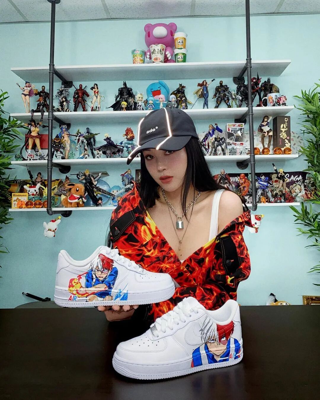 甚至还定制了一双以「轰焦冻」为主题的Air Force 1,背后满墙的手办也能看出资历不浅!