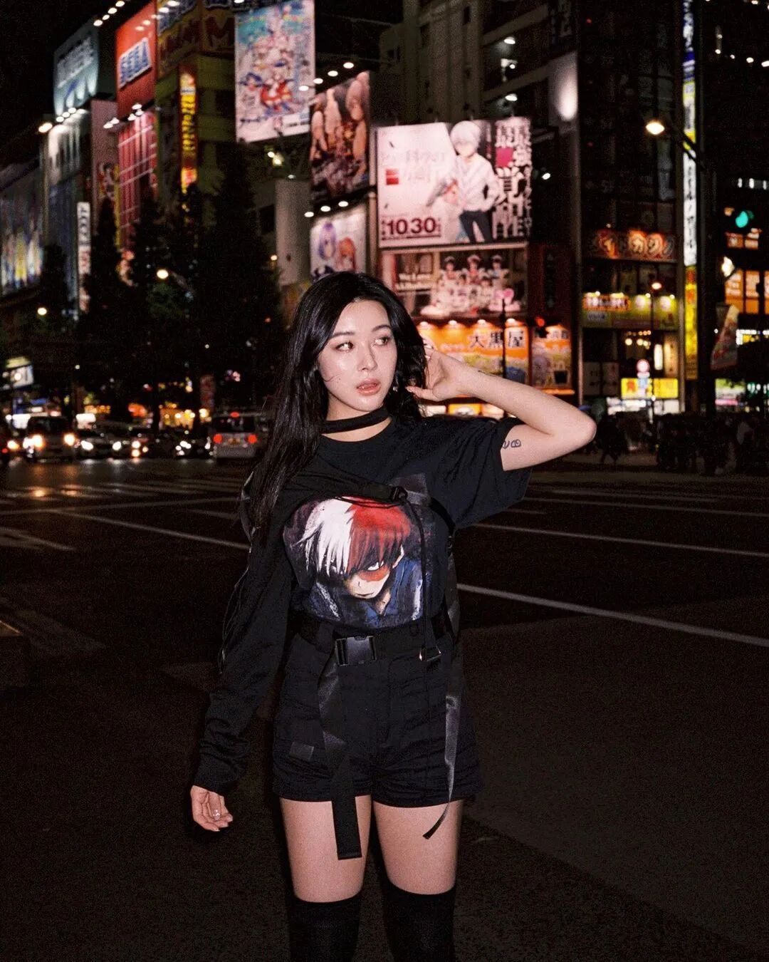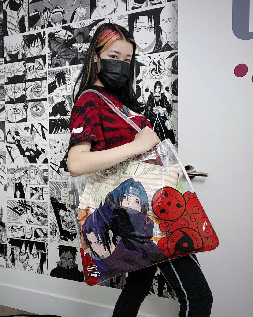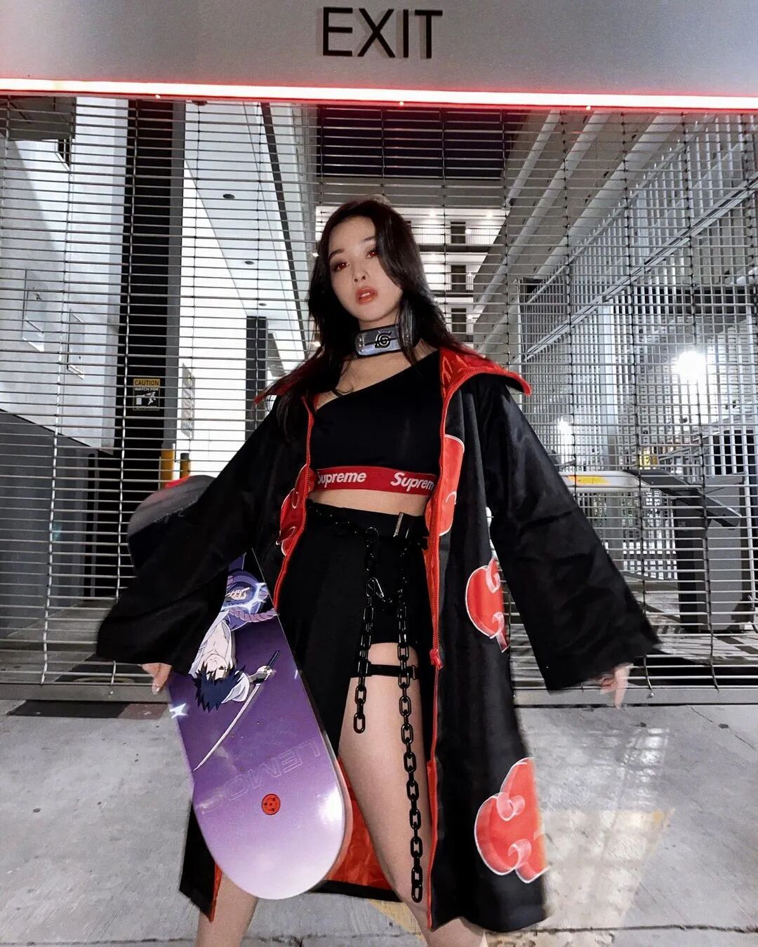 光穿着周边单品还不够,还专门出了鼬的COS,从护额到写轮眼,还有用Remake的Supreme上衣搭配「晓」组织的外套,认真的演绎了别具潮流感的二次元女孩。