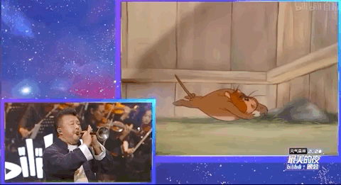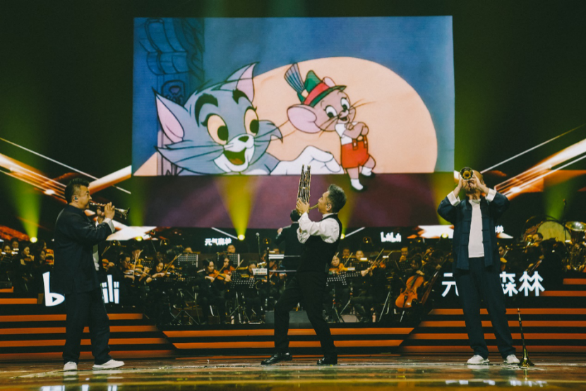 东方的唢呐、笙和西方交响乐齐鸣,大屏幕上播放着动画混剪UP主剪辑的《猫和老鼠》,这种混搭实在太奇妙了有没有?!