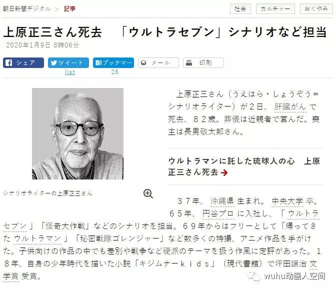 日本动画、特摄剧脚本家 上原正三因肝脏癌去世,享年82岁。上原正三老师曾参与编剧作品有《北斗神拳》动画、《赛文奥特曼》、《泰罗奥特曼》、《艾斯奥特曼》、《迪迦奥特曼》等多部知名作品。
