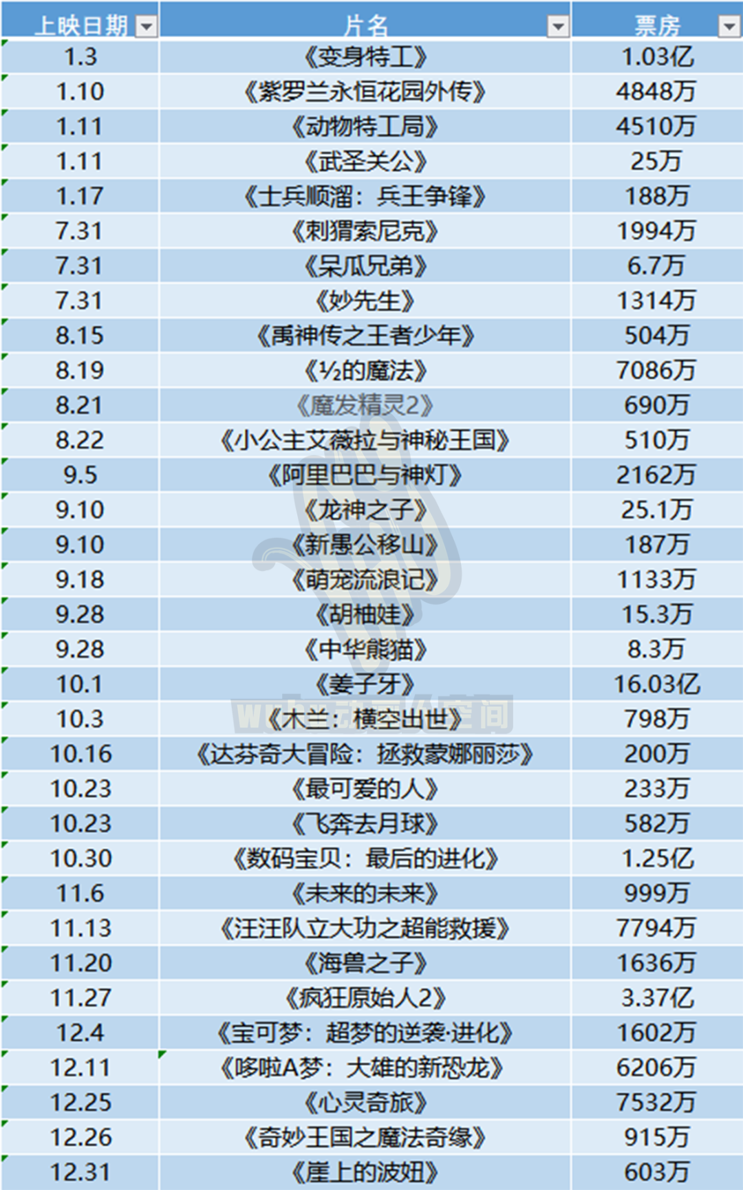 2020年国内上映动画电影片单和票房统计:截止2020年12月31日19时