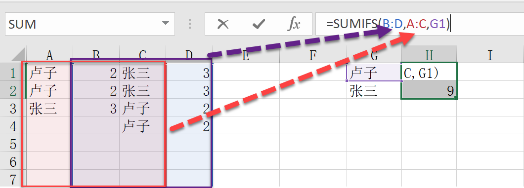 写区域的时候,都要错位,第一列求和区域到最后一列求和区域也就是B:D,第一列条件区域到最后一列条件区域也就是A:C,这个是关键点。