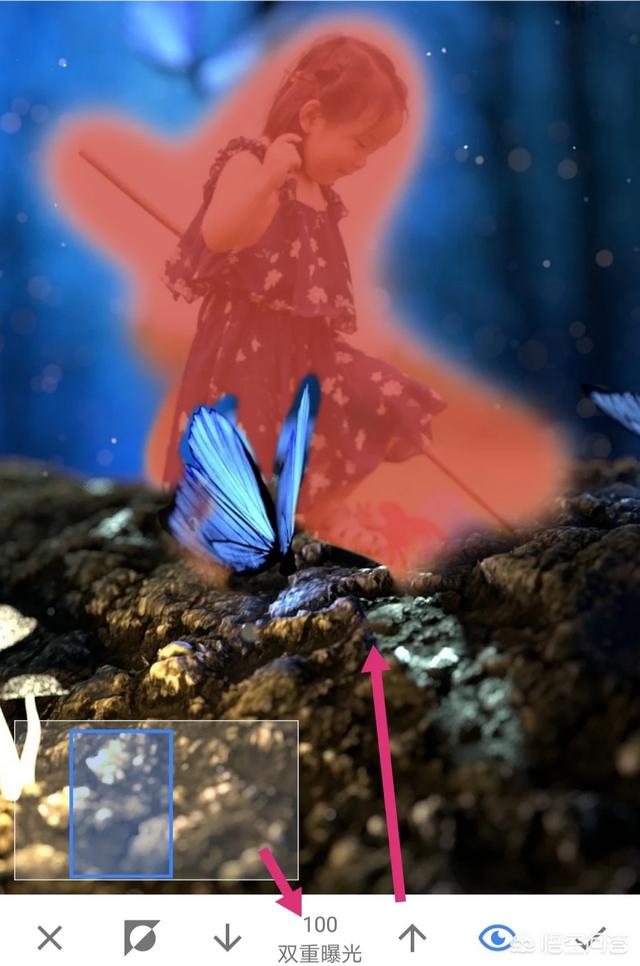 5微信朋友圈屏蔽二维码怎么办怎么修图、进入到新的界面,点击向上的箭头,把双重曝光数值调为100,对添加小朋友的位置,进行涂抹。小朋友显示出来了。