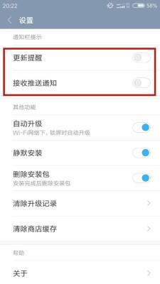 依次点击进入:【应用商店】——【我的】——【设置】——关闭【更新提醒】和【接收推送通知】怎么关闭微信朋友圈推送的广告。