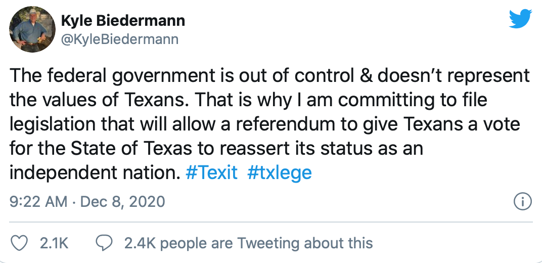 “联邦政府已经失控了,无法代表德州人民的价值。因此,我致力于提交一份立法,允许进行人民公投,让德克萨斯成为一个独立的国家。”