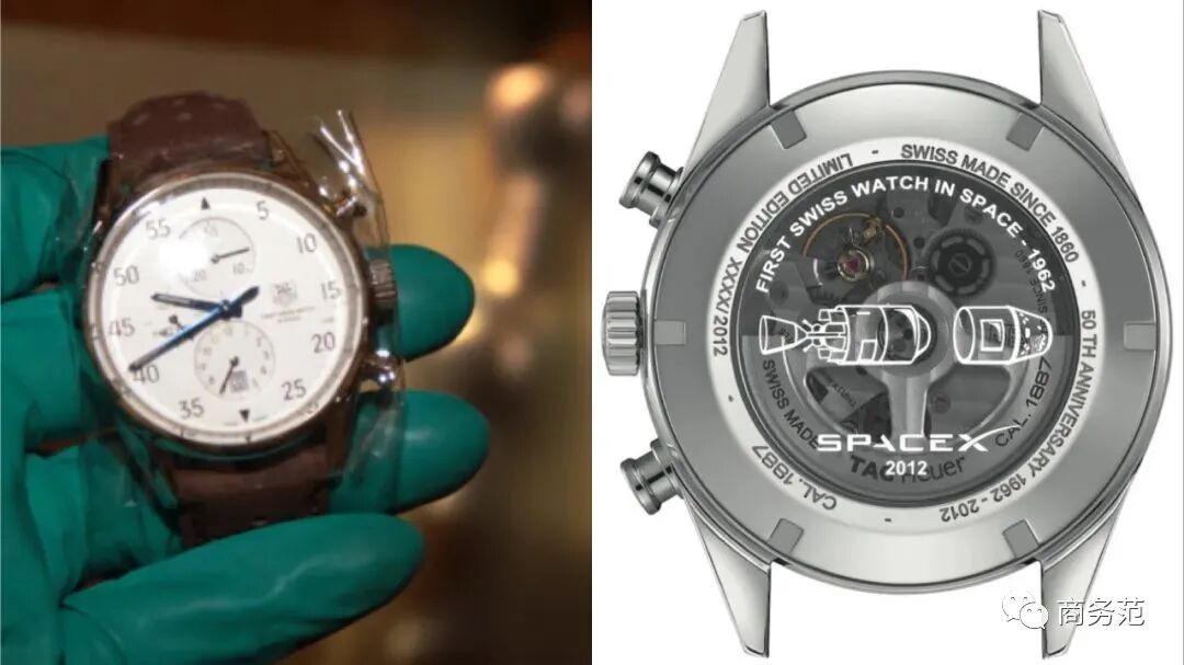 这块表倒是蛮有故事。来自品牌的Carrera系列,前身是美国首位环地球飞行的宇航员约翰·格伦,在1962年上太空时带的泰格豪雅计时秒表。定制款算是复刻了它,表背还定制了Space X的标志,比较有纪念意义。