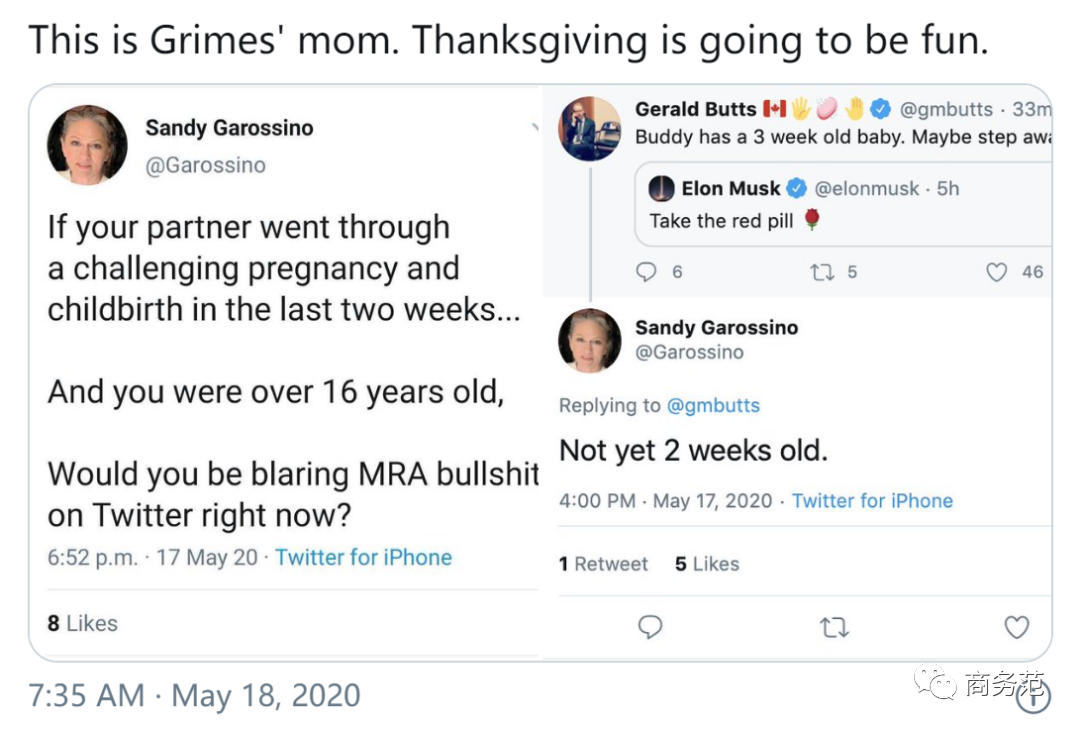 Grimes的妈妈之前还在推特上喷过马斯克,说"如果你的伴侣过去两周经历了一次具有挑战性的怀孕和分娩......你现在会在推特上胡说八道吗?”感觉其中的关系也是很迷……