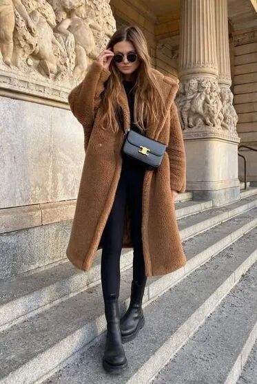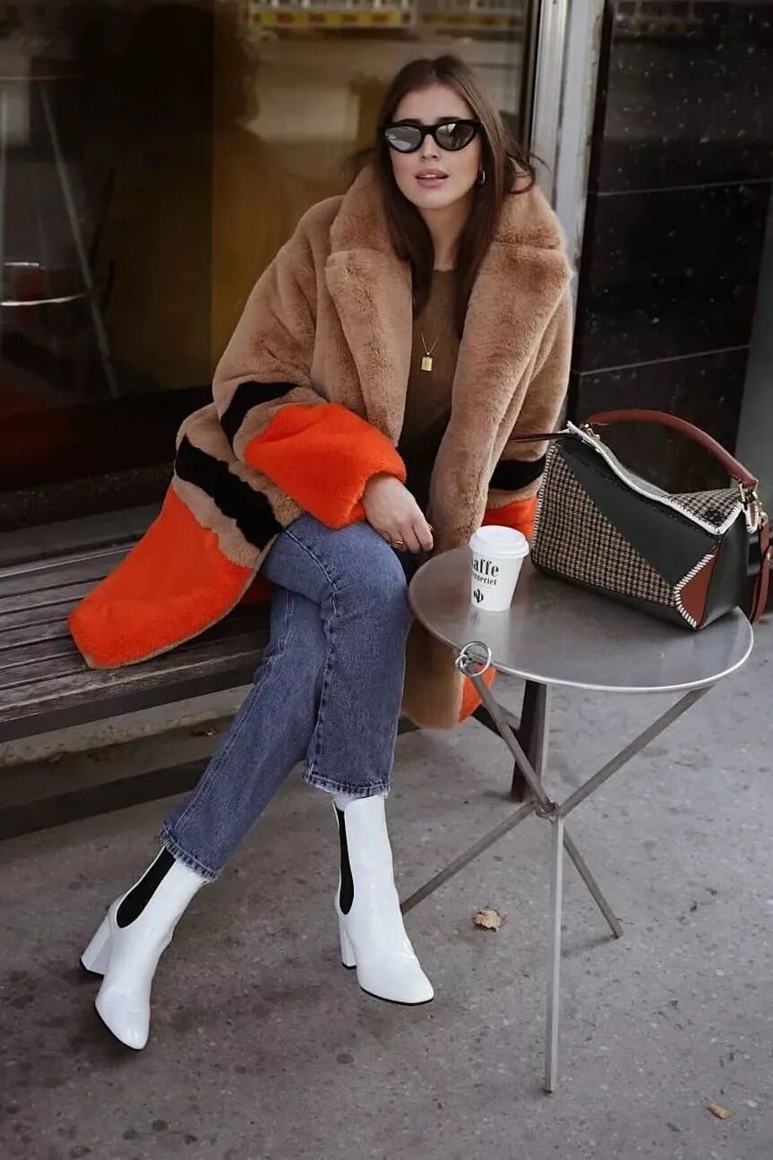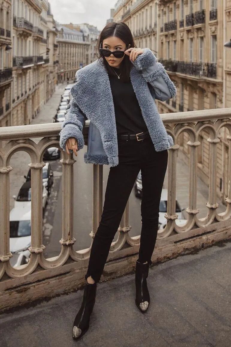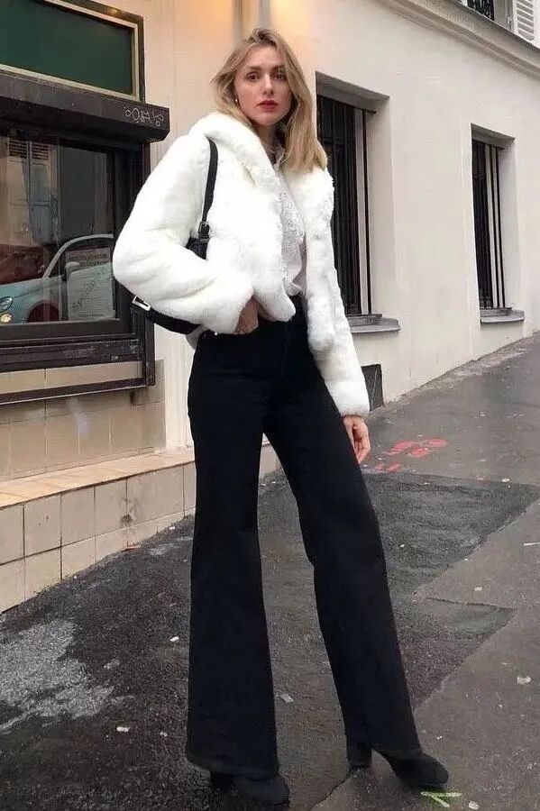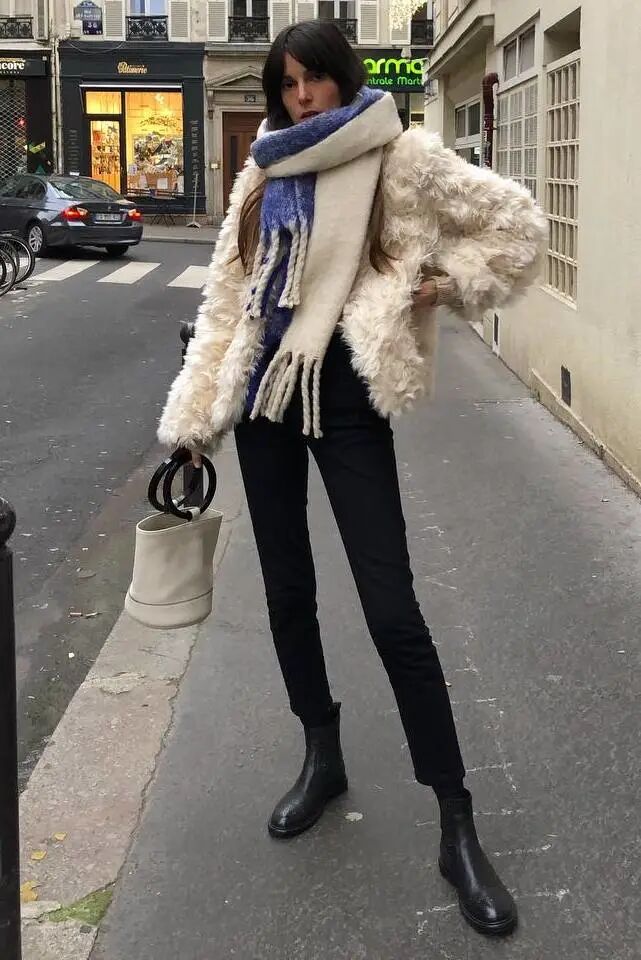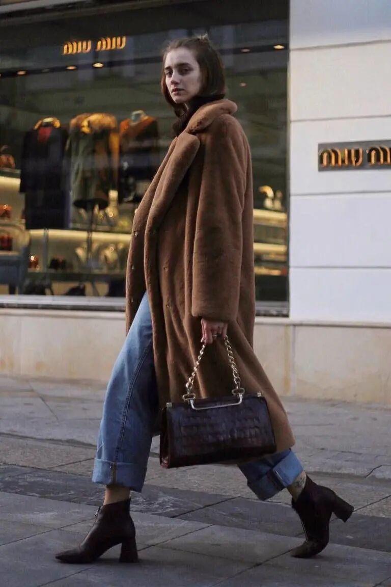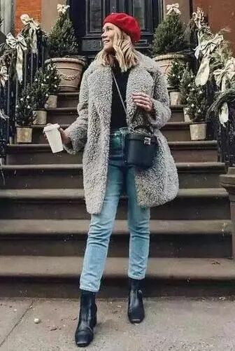 特别是这种易显浮夸老气的毛绒仿皮草外套,混搭九分直筒裤+短靴绝对是最正确时髦的打开方式了,