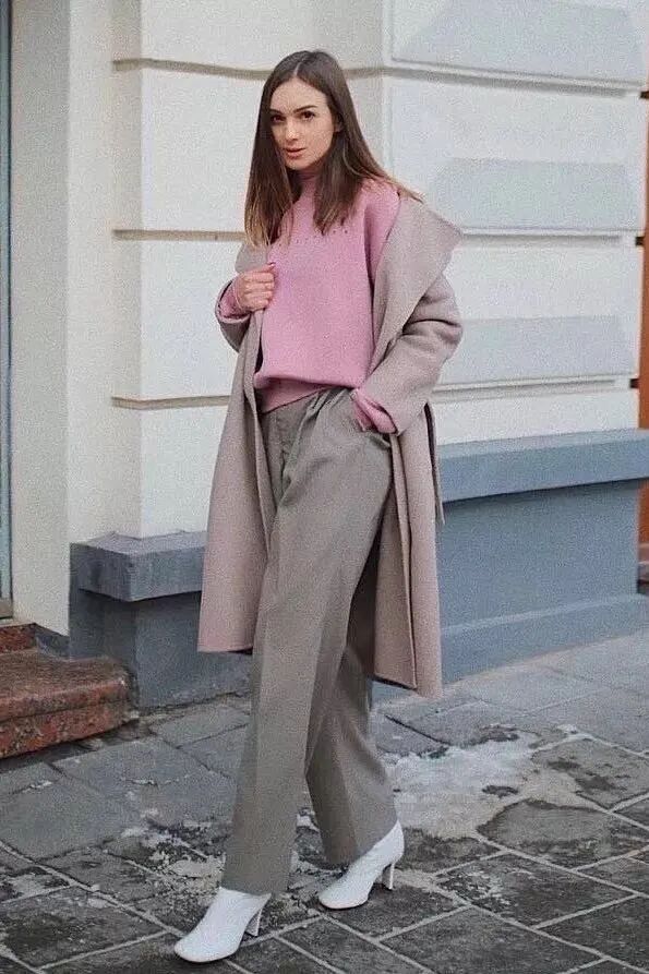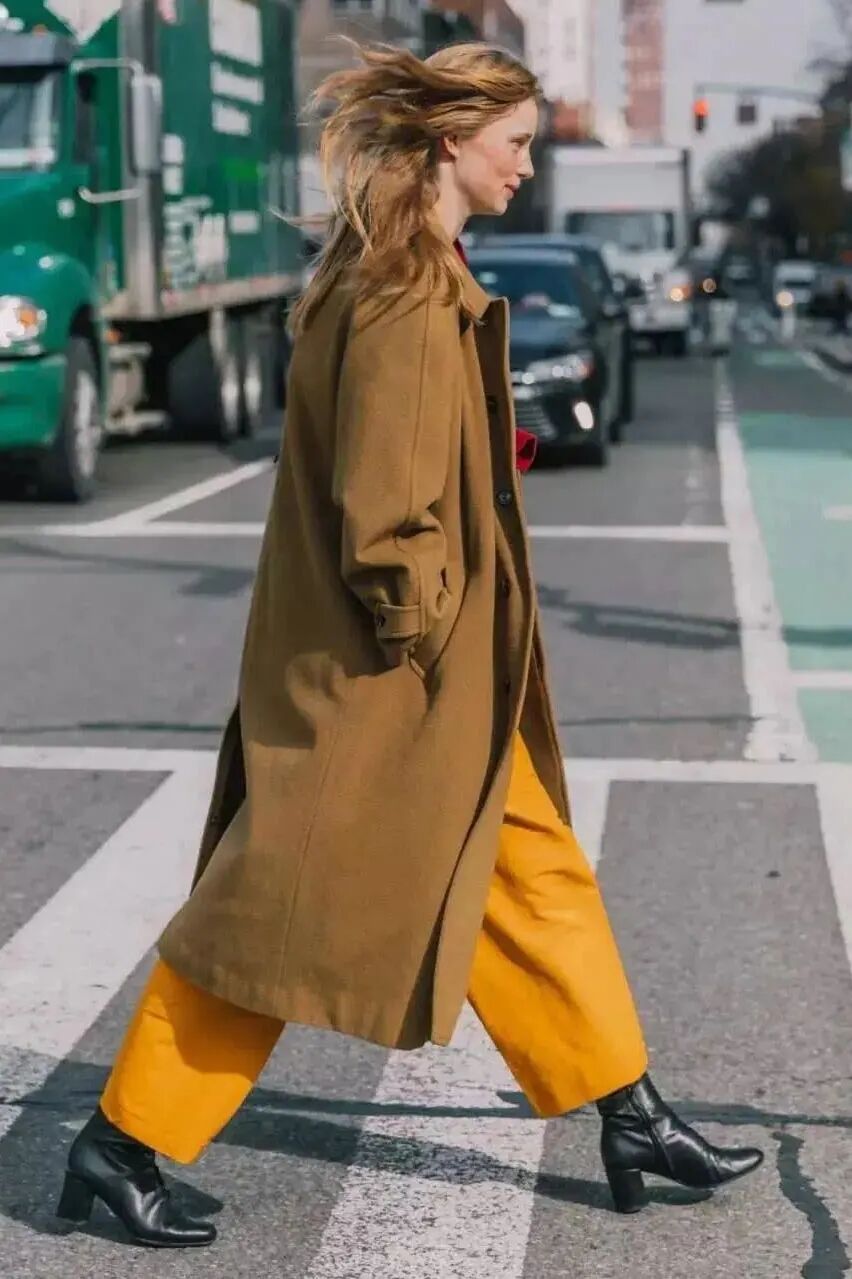 九分阔腿裤与短靴在颜色上可以选择相近的颜色,这样会让你的造型更具整体和谐感,