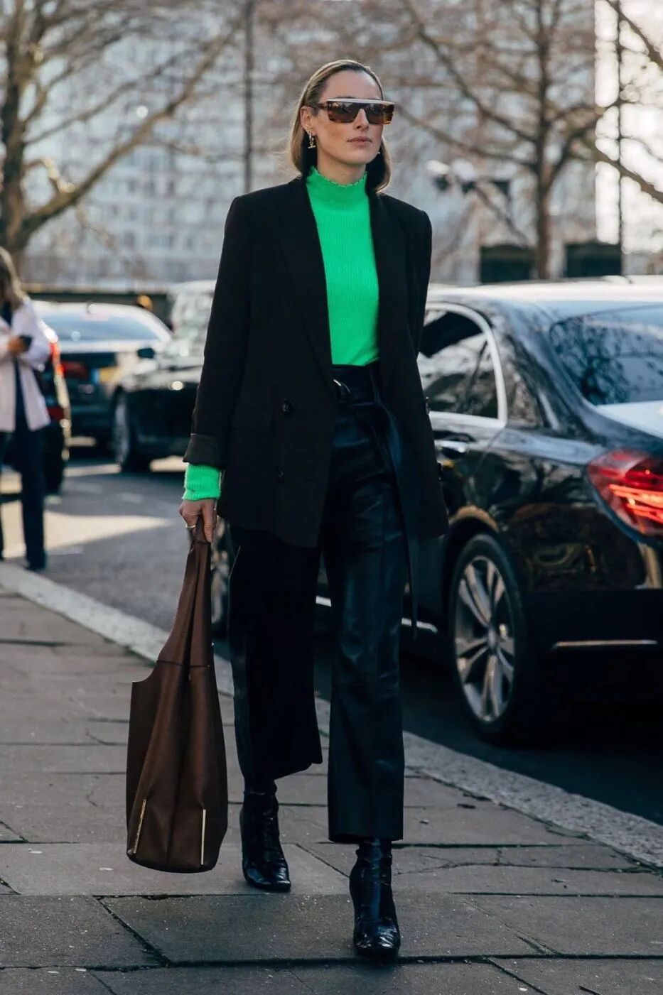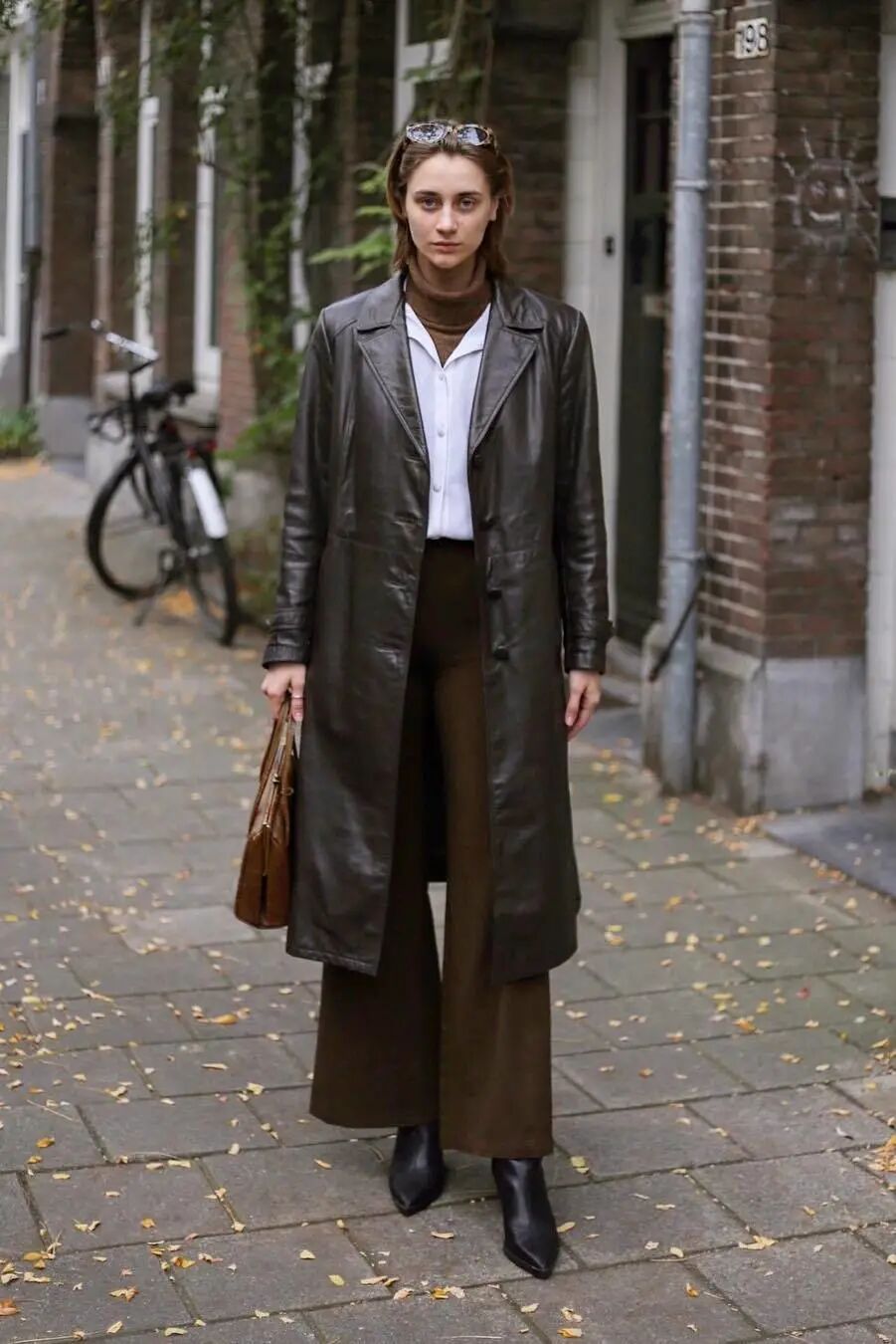 或者你也可以在九分烟管裤的材质面料上穿出新意来,无论是飒气满满的皮质烟管裤,