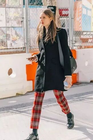 如果穿腻了纯色基础款,复古韵味更浓厚的九分格纹烟管裤+短靴的组合值得你拥有,vintage感十足充满文艺英伦范。
