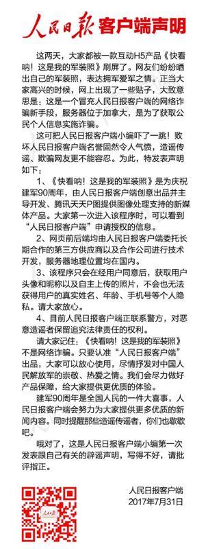 人民日报客户端、人民日报官方微博同步发布声明,请大家放心,《快看呐EAL0.UF,iO@!Y#8BTIeKHqRA&jsqP,这是我的军装照》不是网络诈骗: